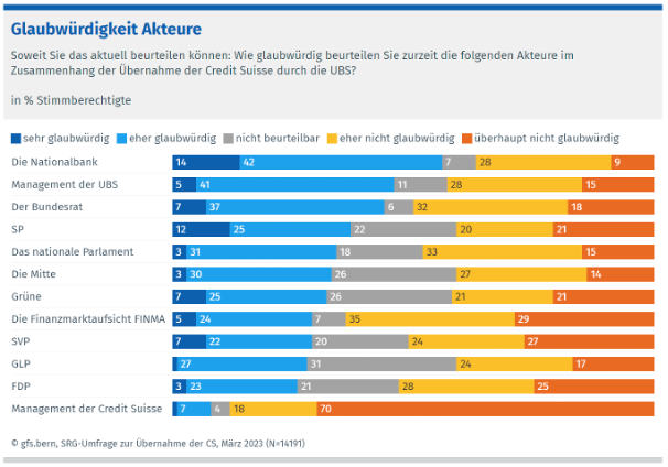 Das mangelnde Vertrauen zeigte sich auch in einer SRG-Umfrage kurz nach der Zwangsübernahme. Die Befragten sollten die Glaubwürdigkeit verschiedener Beteiligter einschätzen. Das Ranking zeigt: Während der Übernahme der Credit Suisse hatte sich die Schweizerische Nationalbank (SNB) als glaubwürdigster Akteur erwiesen. Dabei dürfte die SNB von einem traditionell soliden Vertrauensniveau in der Schweizer Bevölkerung profitiert haben. Im Gegensatz zur SNB war das Vertrauen in die Eidgenössische Finanzmarktaufsicht deutlich geringer. An zweiter Stelle stand die Führung der UBS, die als noch glaubwürdiger wahrgenommen wurde als der Bundesrat. Die Führung der CS war das Schlusslicht der Rangliste.3