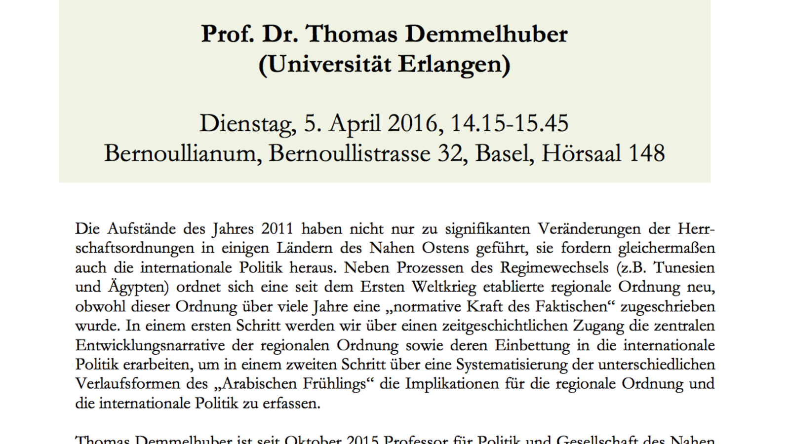 Thomas Demmelhuber ist seit Oktober 2015 Professor für Politik und Gesellschaft des Nahen Ostens an der FAU Erlangen-Nürnberg. 2015 wurde er ebenso zum Visiting Professor am College of Europe (Natolin) ernannt. Zuvor war Demmelhuber Juniorprofessor für Politikwis- senschaft mit dem Schwerpunkt Politik und Internet an der Universität Hildesheim (2012- 2015). In seinen Forschungsarbeiten beschäftigt sich Demmelhuber aus vergleichender Per- spektive mit unterschiedlichen Formen von Staatlichkeit und Begründungsformen von Herr- schaft im Nahen Osten mit besonderem Fokus auf die Golfmonarchien und Ägypten unter Einbezug der internationalen Politik (v.a. Europäische Union)