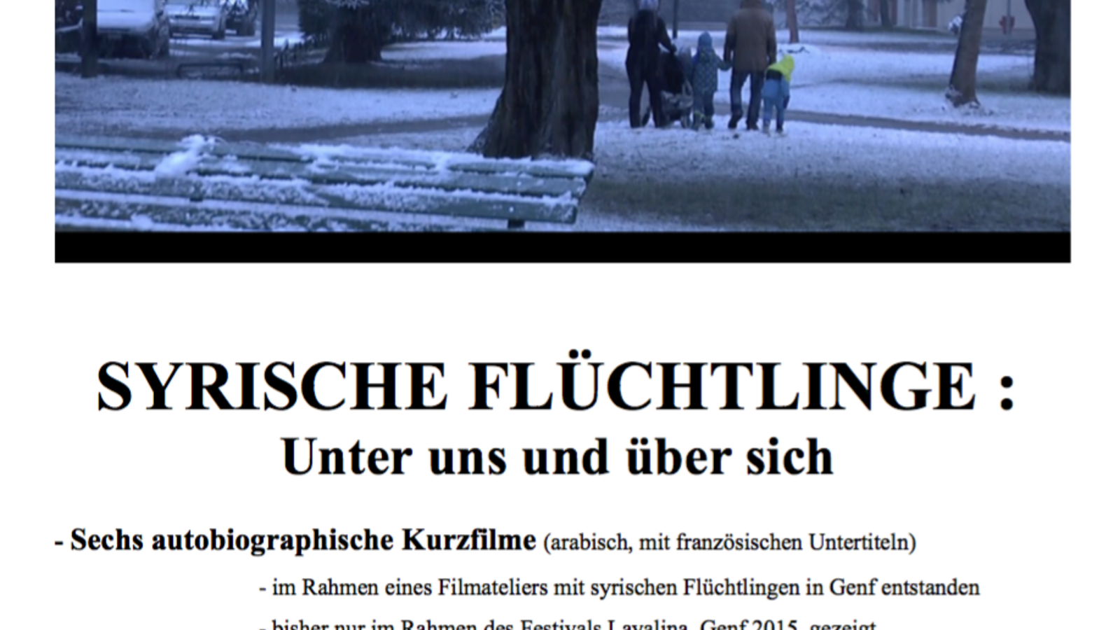 Sechs autobiographische Kurzfilme (arabisch, mit französischen Untertiteln): im Rahmen eines Filmateliers mit syrischen Flüchtlingen in Genf entstanden und bisher nur im Rahmen des Festivals Layalina, Genf 2015, gezeigt.