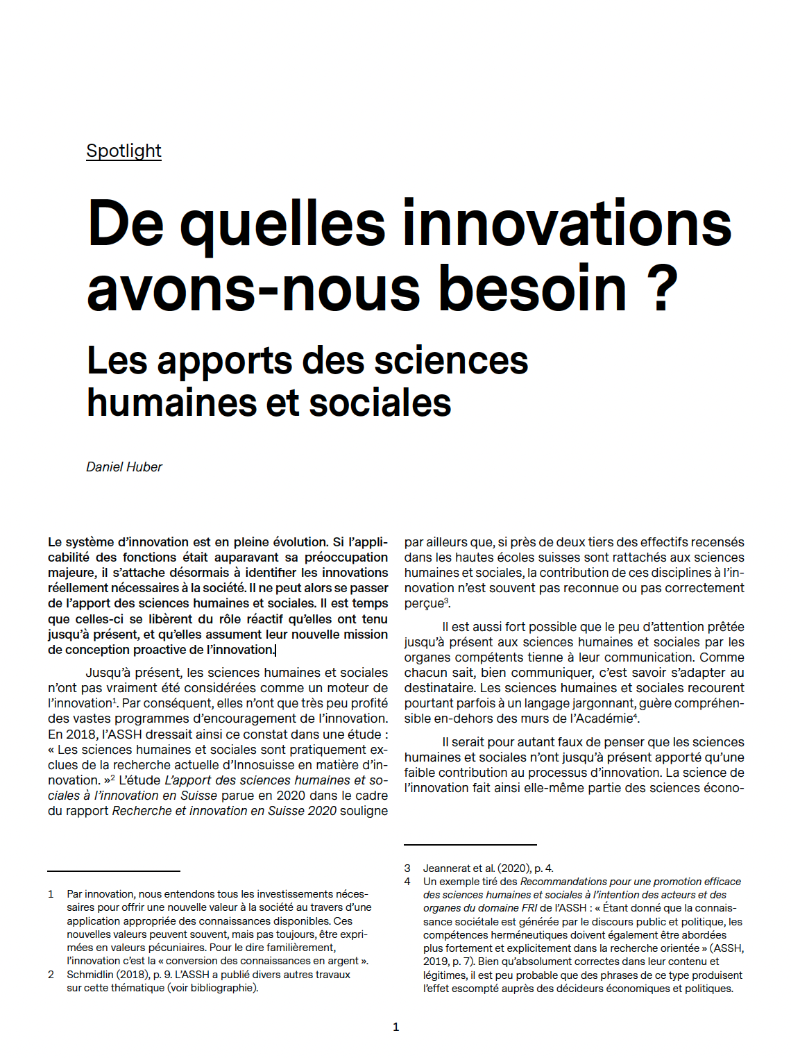 Professeur émérite de gestion de l’innovation, Daniel Huber a déclaré dans un article du nouveau Bulletin de l’ASSH: «Il est temps que les sciences humaines et sociales se libèrent de leur rôle jusqu’à présent réactif et commencent à concevoir l’innovation de manière proactive.» Selon lui, les conditions actuelles sont très favorables à un regain d’influence des sciences humaines et sociales: le paysage suisse de l’innovation est en pleine évolution. Si l’applicabilité des fonctions (ou l’optimisation des produits existants) était auparavant sa préoccupation majeure, il s’attache désormais à identifier les innovations réellement nécessaires à la société et celles qui ne le sont pas.