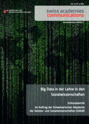 Le colloque «Big Data in den Sozialwissenschaften», organisée par l'ASSH à l'automne 2018, s'est interrogée sur les promesses de « Big Data » dans les sciences sociales en Suisse. La conclusion était que de nouvelles méthodes basées sur les mégadonnées se sont établies dans les différents domaines. Un exemple est l'analyse statistique de grands volumes de texte numérique (« texte en tant que données »). Dans l'ensemble, cependant, la promesse de des mégadonnées n'a pas encore été satisfaite, comme l'a souligné Lucas Leeman, politologue et co-fondateur du Digital Democracy Lab de l'Université de Zurich. Il y a encore beaucoup de potentiel pour de nouvelles questions de recherche.