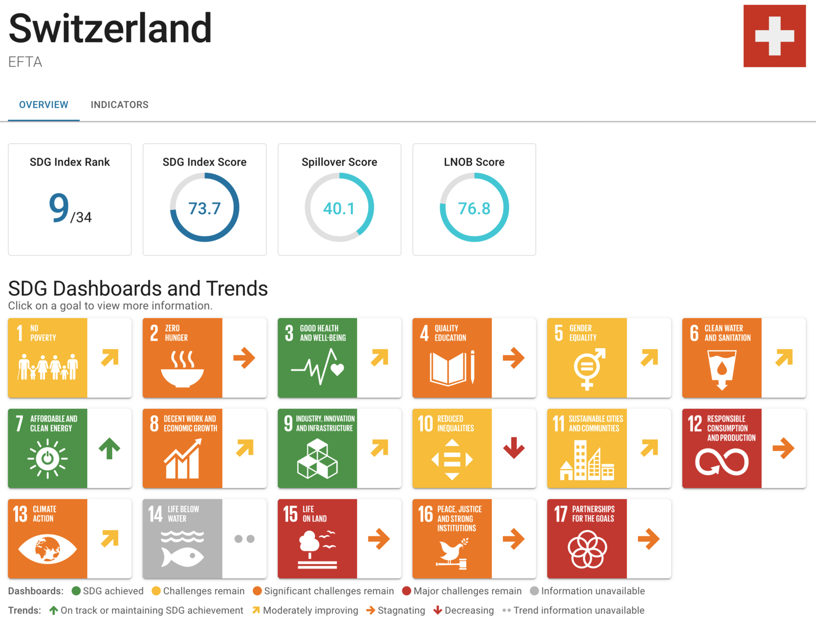 Extrait du profil de la Suisse (extrait des profils par pays). Source : Lafortune, G., Fuller, G., Bermont-Diaz, L., Kloke-Lesch, A., Koundouri, P., Riccaboni, A. (2022). Achieving the SDGs: Europe’s Compass in a Multipolar World. Europe Sustainable Development Report 2022. SDSN and SDSN Europe. France: Paris.