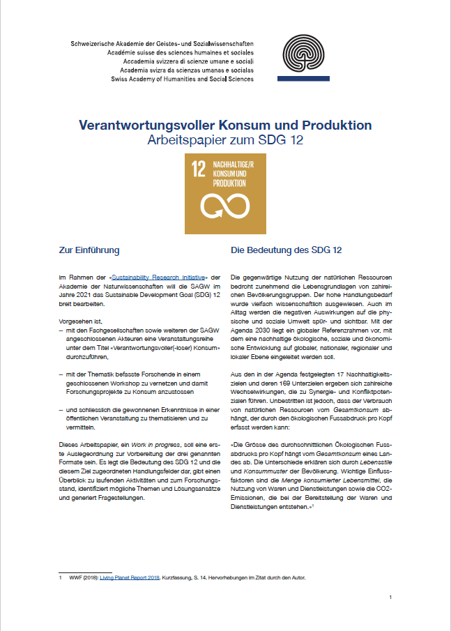 Pour lancer son activité thématique, l'ASSH a publié un document de travail s'attachant à situer la signification du SDG 12 et des champs d’action qui lui sont associés dans le cadre de l’Agenda 2030. Il fournit un aperçu global des activités en cours et de l’état de la recherche. Il identifie également des thèmes ainsi que des pistes de solutions et formule enfin des problématiques afin d'inscrire le thème de la consommation durable dans le champ des sciences humaines et sociales. Quels récits, expériences et images le monde de la consommation véhicule-t-il ? Quels sont les modèles de réduction possibles ? La thèse de Max Horkheimer et Theodor W. Adorno selon laquelle toute civilisation avancée modifie massivement, voire détruit l’environnement naturel est-elle vraie ? Comment concilier la nécessité d’un changement rapide avec des processus de démocratie (directe) soumis à une certaine lenteur et à la légitimation ?