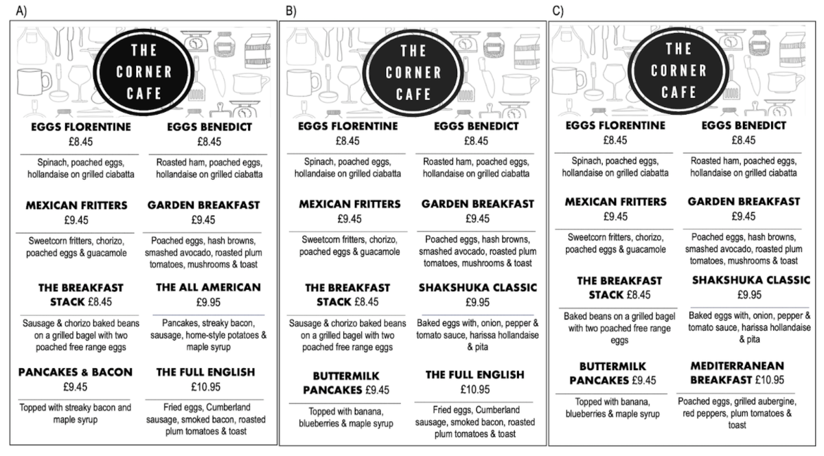 To investigate this, I and my colleague Sophie Attwood presented meat eaters with menus that had different amounts of meat and vegetarian dishes. Menus were composed of either 25% (menu A), 50% (menu B) or 75% vegetarian dishes (menu C), and participants were asked to make hypothetical choices about what dishes they would order.