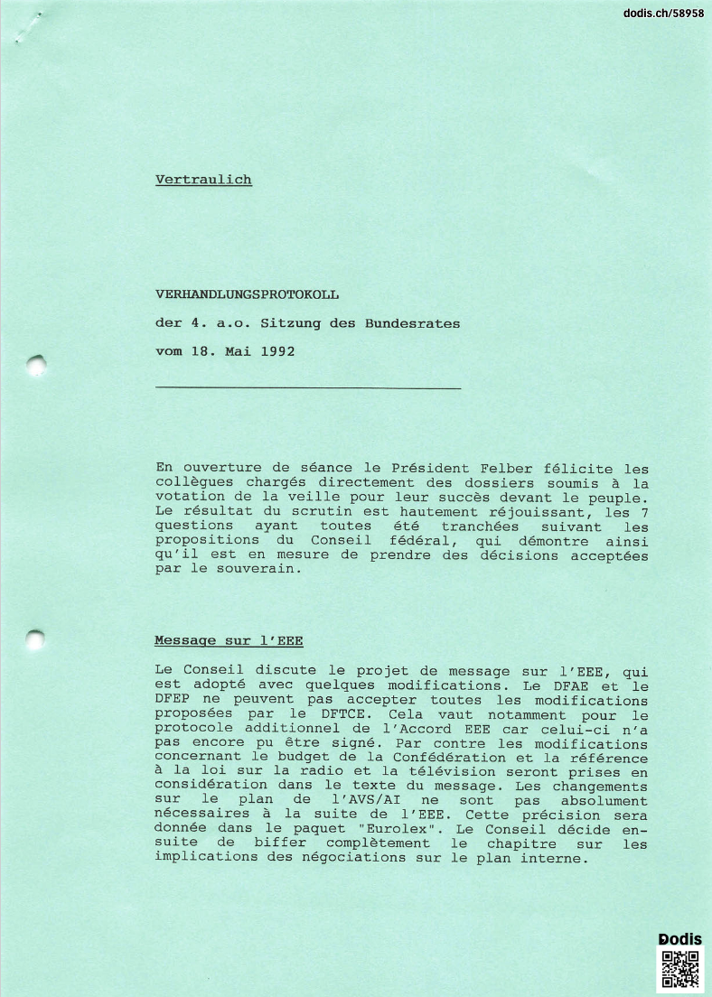 In erster Linie erachte ich es als einen bemerkenswerten Entschluss des Bundesrats, der ja eigentlich in der Europafrage tief gespalten war. Es ist wohl eine seiner mutigsten Entscheidungen, die wir bisher in den Akten gefunden haben.