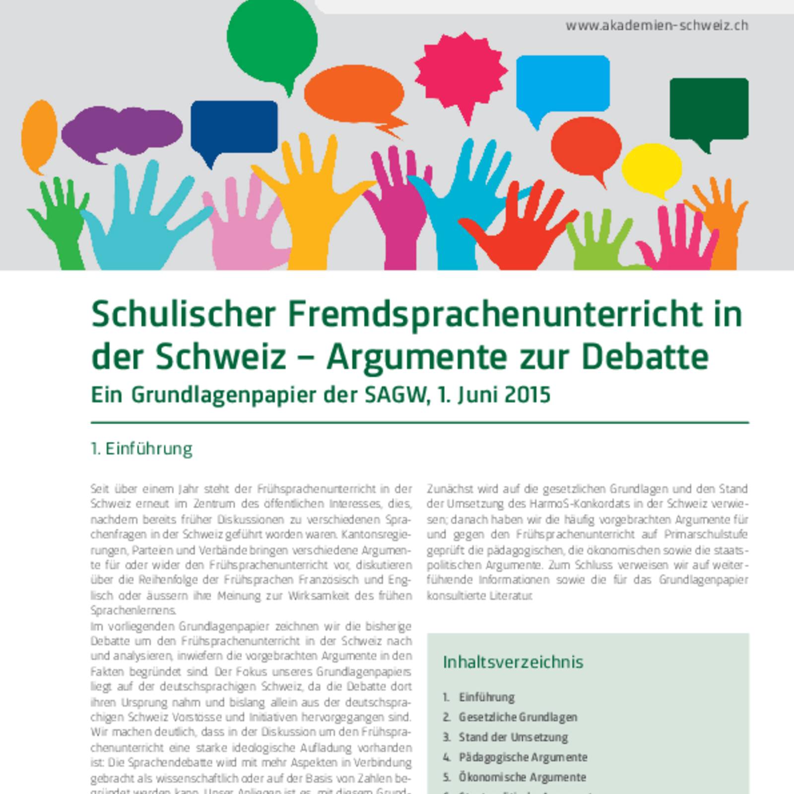 Seit über einem Jahr steht der Frühsprachenunterricht in der Schweiz erneut im Zentrum des öffentlichen Interesses, dies, nachdem bereits früher Diskussionen zu verschiedenen Sprachenfragen in der Schweiz geführt worden waren. Kantonsregierungen, Parteien und Verbände bringen verschiedene Argumente für oder wider den Frühsprachenunterricht vor, diskutieren über die Reihenfolge der Frühsprachen Französisch und Englisch oder äussern ihre Meinung zur Wirksamkeit des frühen Sprachenlernens. Im vorliegenden Grundlagenpapier zeichnen wir die bisherige Debatte um den Frühsprachenunterricht in der Schweiz nach und analysieren, inwiefern die vorgebrachten Argumente in den Fakten begründet sind.