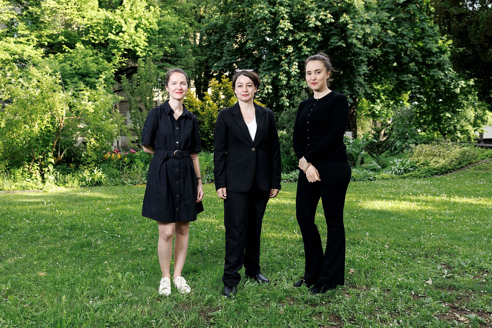 Von links nach rechts: Stéphanie Soubrier (Erster Preis), Anne-Sylvie Dupont (Jurypräsidentin), Madeline Woker (Zweiter Preis). Auf dem Bild fehlt Magdalena Breyer (Dritter Preis). Copyright: Pierre-Yves Massot.