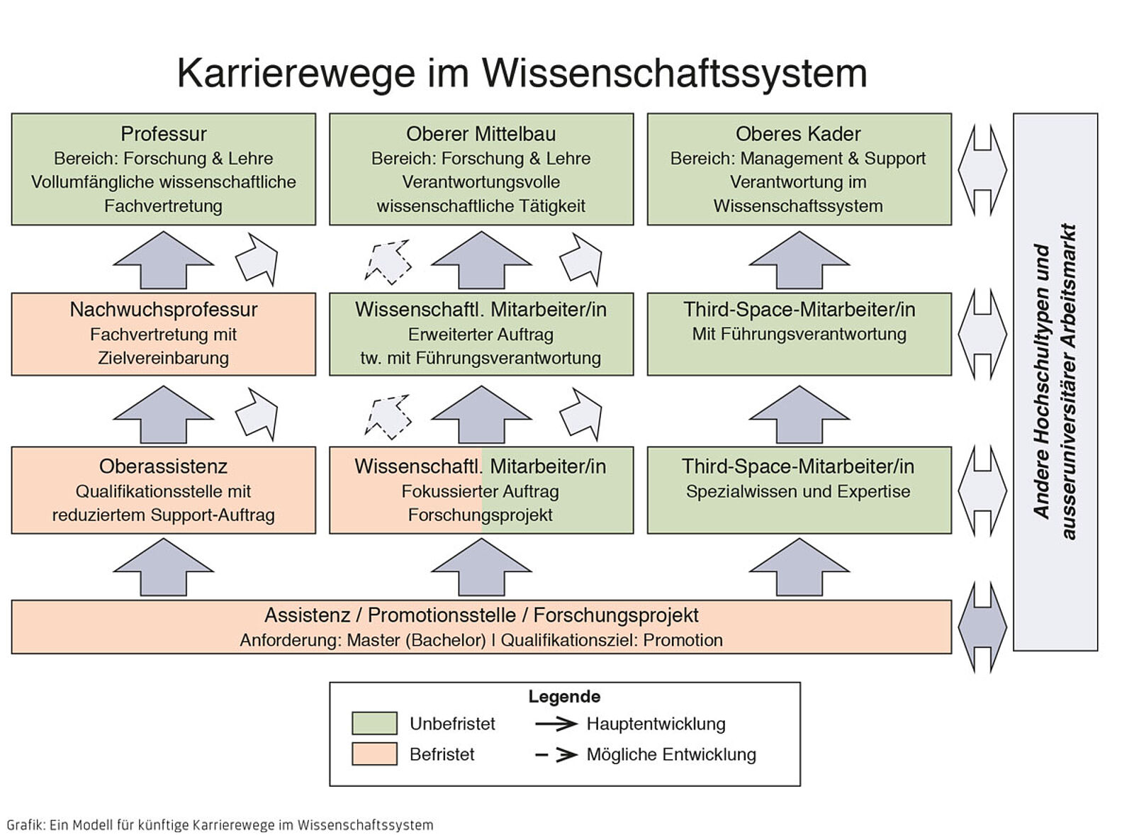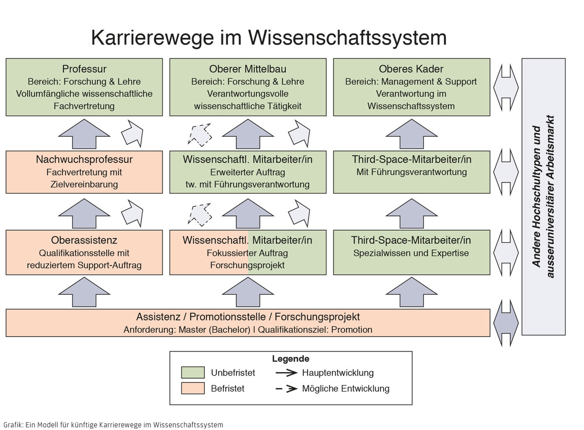 Das im Bericht «Next Generation» vorgeschlagene Modell (Abb. 1) sieht Durchlässigkeiten zwischen den verschiedenen Karrierewegen vor. Doch gibt es einen Weg aus dem Forschungsmanagement zurück in die Forschung? Darf beispielsweise ein erfolgreicher Hochschulmanager eine Professur erhalten, auch wenn er keine Habilitation vorzuweisen hat? Es brauche auch auf alternativen Karrierewegen Perspektiven, die ähnlich attraktiv seien wie eine Professur, sagte Christina Röcke von der Universität Zürich. Ansonsten könnte sich der Third Space als Abstellgleis erweisen – nicht zuletzt für weibliche Forscherinnen.