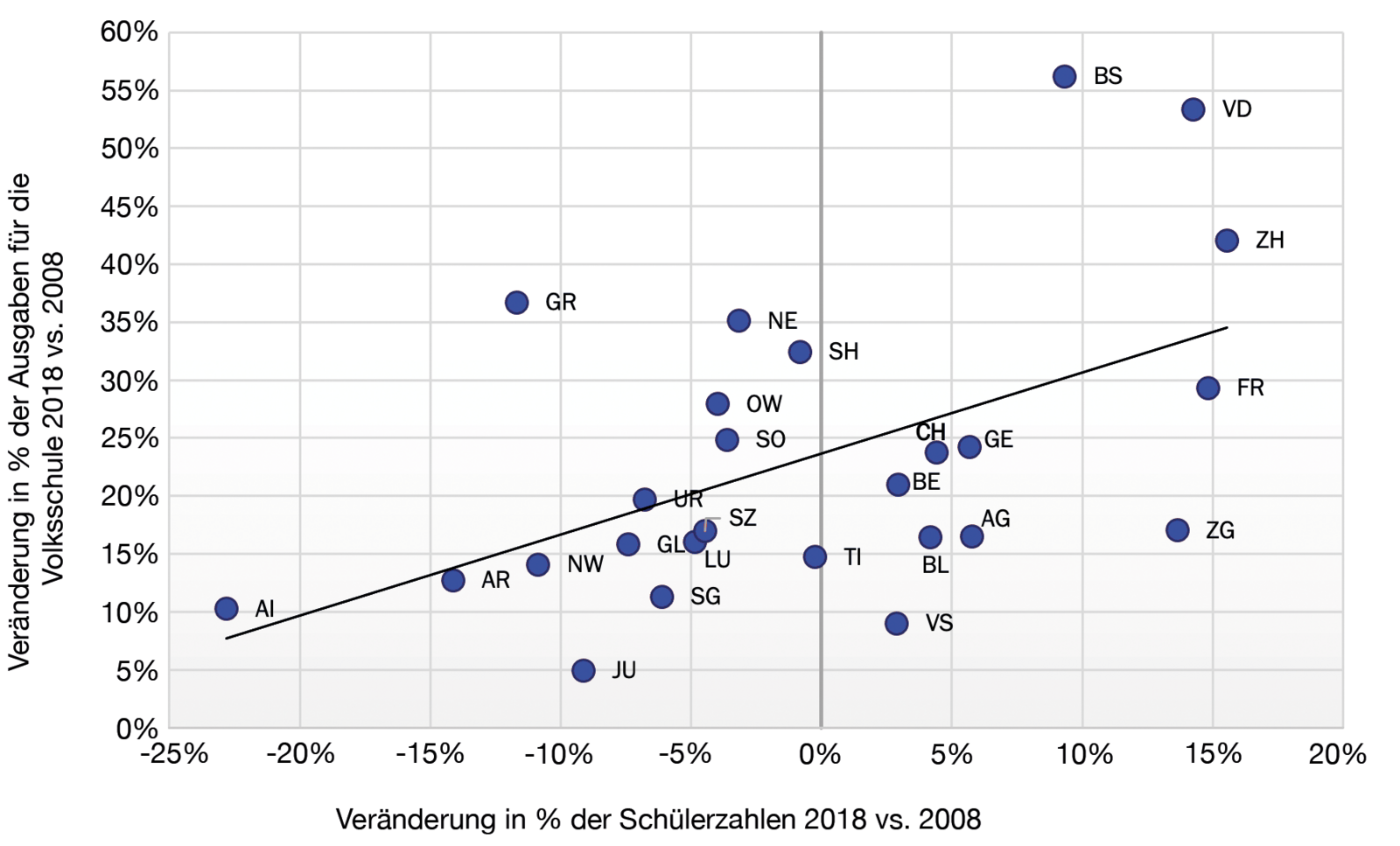 - Die Kantone wählen unterschiedliche Strategien bei der Anpassung der Bildungsausgaben an die demografische Entwicklung: Ein gutes Drittel der Kantone und ihre Gemeinden haben die Ausgaben für die Volksschulbildung in den letzten Jahren deutlich stärker angehoben als die Ausgaben für die Hochschulbildung, in einem weiteren Drittel fällt das Ausgabenwachstum sowohl für die obligatorische Schulstufe als auch für die Tertiärbildung A (akademische Bildung) unterdurchschnittlich aus. In einigen Kantonen wie Baselland, Wallis oder Zug sind die Ausgaben für die Hochschulbildung im Verhältnis zur Anzahl Studierenden überproportional gewachsen, dafür haben sie weniger in die Volksschulbildung investiert. Andere Kantone wie Basel-Stadt, Waadt und Zürich verfolgten eine andere Strategie und haben die Ausgaben für die Volksschulbildung deutlich stärker erhöht, als sich die Lernendenzahlen entwickelt haben.