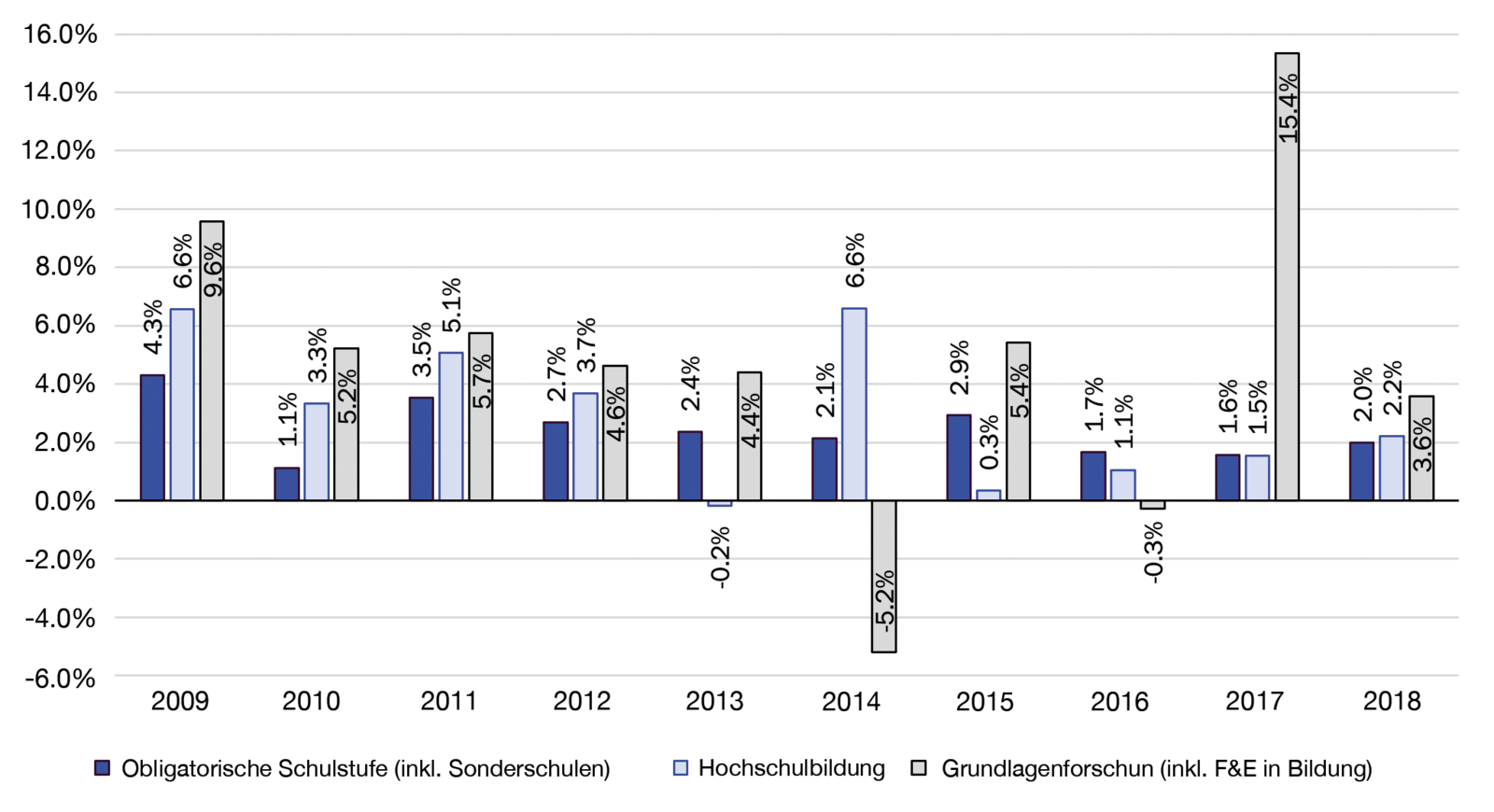 - Die öffentlichen Bildungsausgaben sind im Hochschulbereich stärker gestiegen als für die obligatorische Schulstufe: Die Kantone und ihre Gemeinden haben 2018 für die obligatorische Schulstufe 19,1 Milliarden Franken aufgewendet. Dies entspricht einem Ausgabenzuwachs von 27 Prozent seit 2008. In der gleichen Zeit sind die jährlichen Ausgaben von Bund und Kantonen für die Hochschulbildung um 34 Prozent auf 8,4 Milliarden Franken gestiegen.
