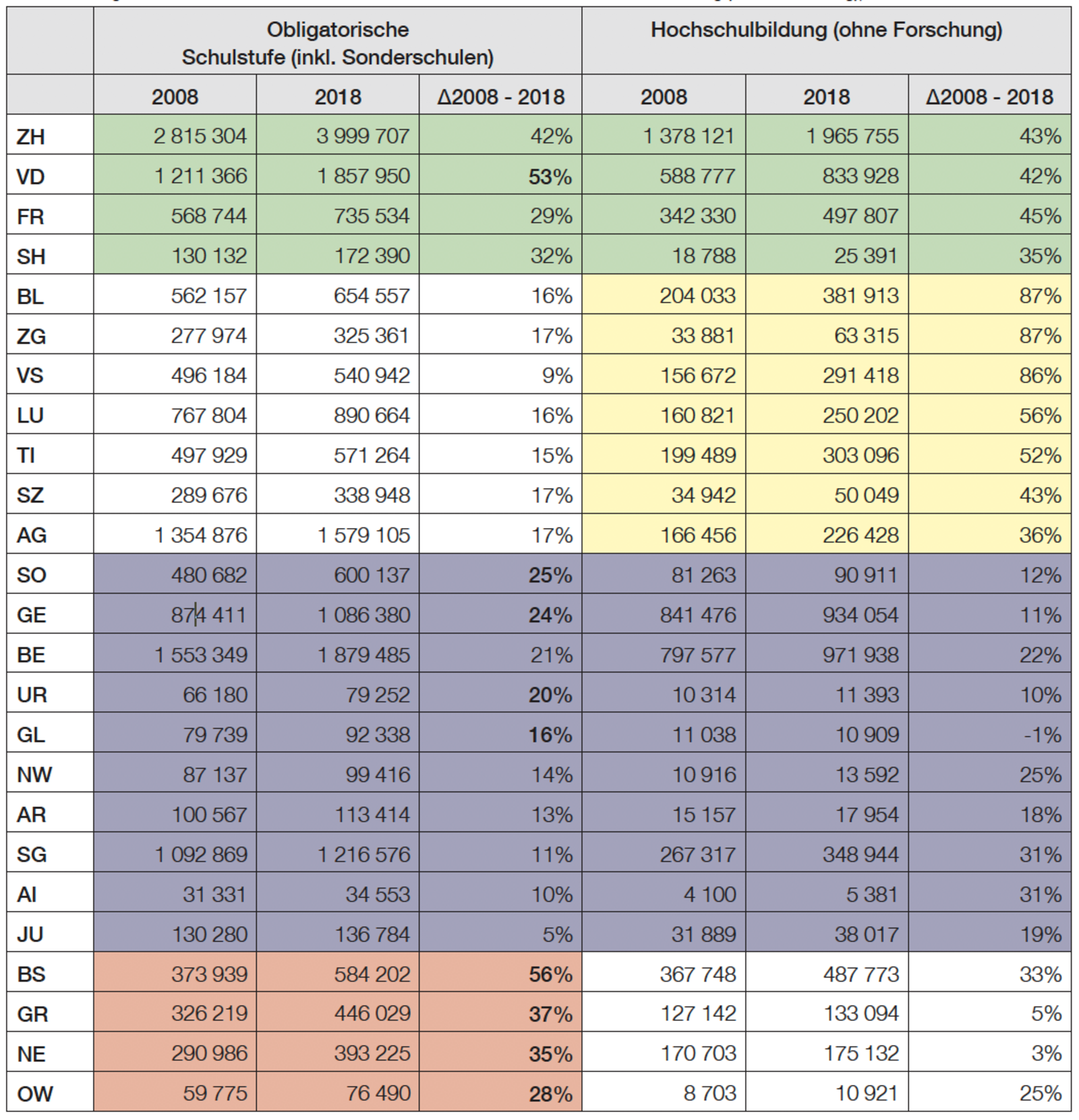 - Steigende Bildungsausgaben pro Einwohnerin und Einwohner: In rund einem Drittel der Kantone sind die öffentlichen Bildungsausgaben pro Einwohnerin und Einwohner für die Volksschulbildung stärker gestiegen als die Ausgaben für die Hochschulen und Grundlagenforschung. In rund zwei Drittel hingegen war es umgekehrt: Hier sind die Ausgaben pro Person für den Hochschulbereich in grösserem Ausmass gestiegen als jene für die Volksschulbildung. Der grösste Teil der Kantone, die zu dieser Gruppe zählen, hat die Ausgaben für die Volksschule um weniger als 10 Prozent pro Einwohnerin und Einwohner angehoben.