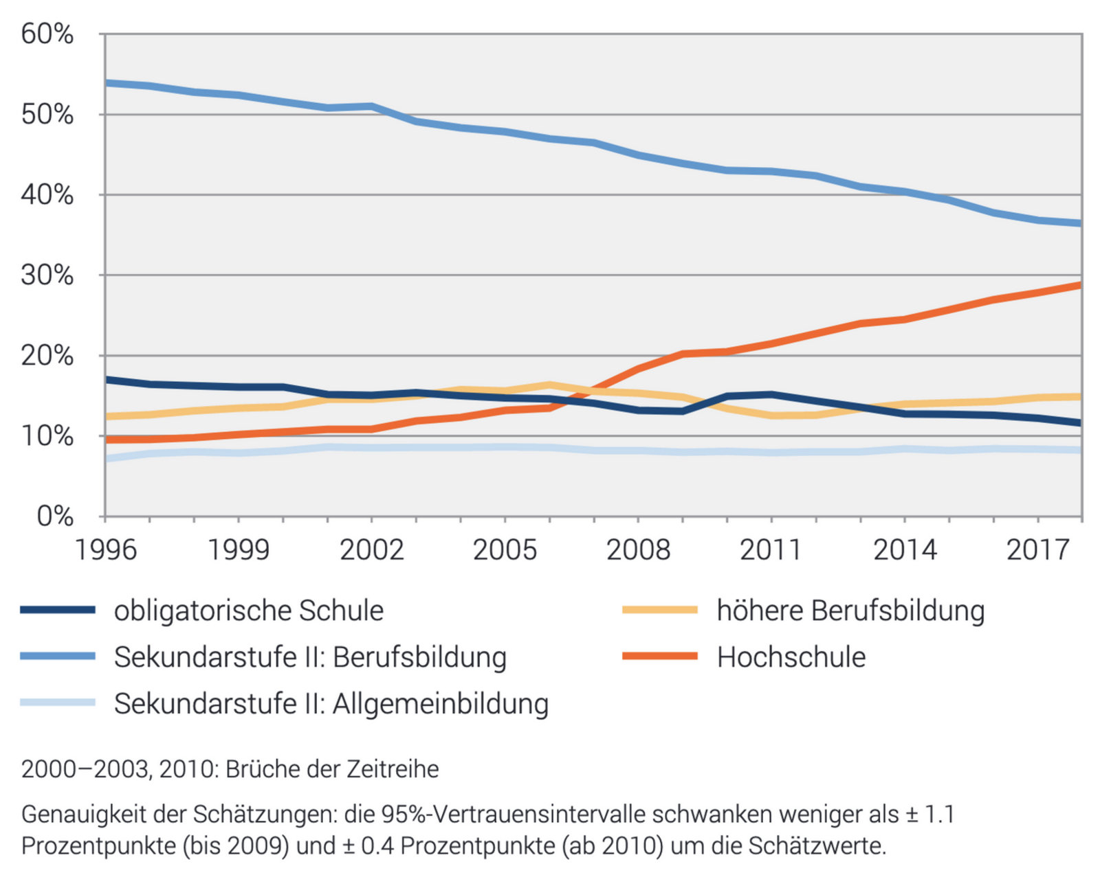 - Die Bildungsaspirationen sind gestiegen. Familien streben für ihre Kinder öfters eine Ausbildung auf Hochschulstufe an, in der französischsprachigen Schweiz ausgeprägter als in der Deutschschweiz.