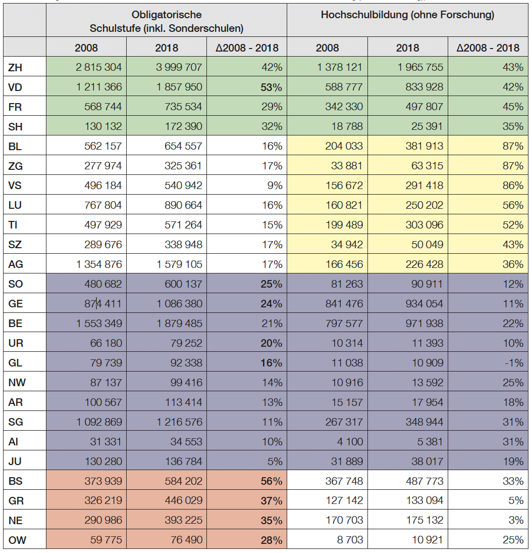 - Die öffentlichen Bildungsausgaben pro Volksschülerin und -schüler sind stärker gestiegen als die Ausgaben pro Hochschulstudentin und -student: Die Kantone und ihre Gemeinden investierten 2018 im Durchschnitt gut 20 000 Franken pro Schülerin und Schüler auf obligatorischer Schulstufe. Dies entspricht im Zehnjahresvergleich einem Anstieg von 22 Prozent. Pro Studentin und Student auf Hochschulstufe gibt der Staat jährlich 34 397 Franken für die Bildung aus. Die Ausgaben pro Studierende sind seit 2008 leicht gesunken (-2 %).