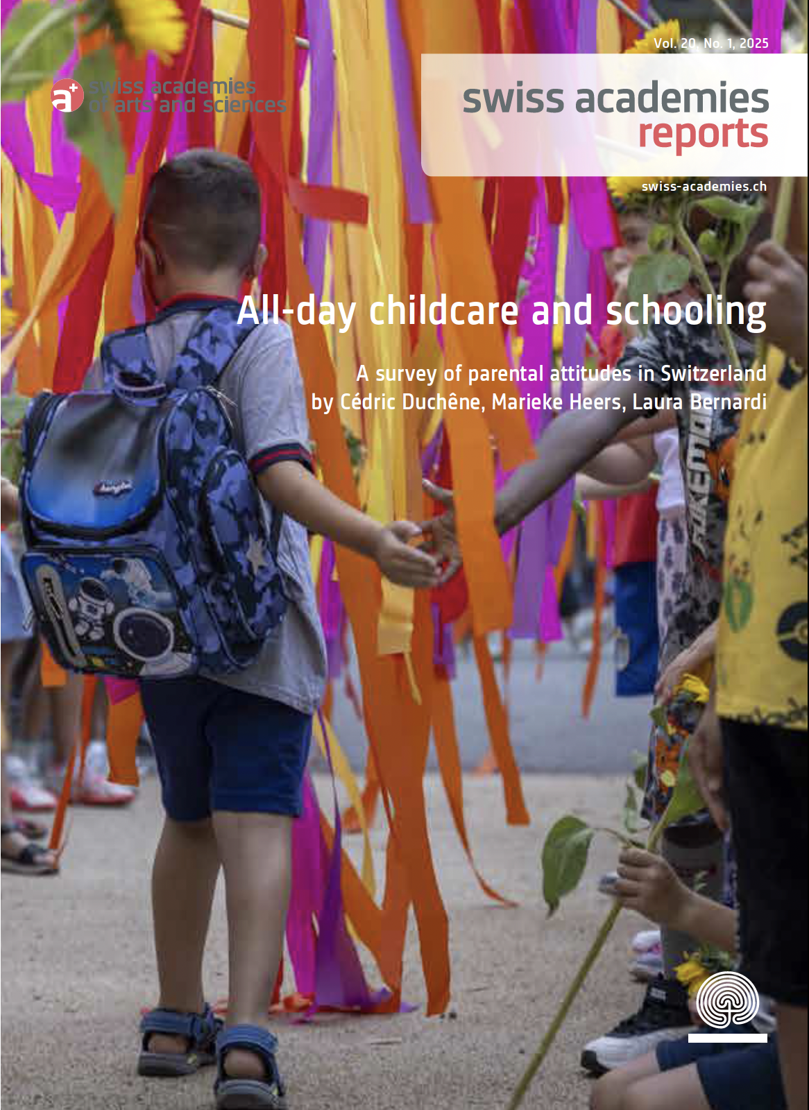 Duchêne, Cédric, Marieke Heers and Laura Bernardi (2025): All-day childcare and schooling. A survey of parental attitudes in Switzerland, ed. by the Swiss Academy of Humanities and Social Sciences (Swiss Academies Reports 20,1). https://doi.org/10.5281/zenodo.14283689