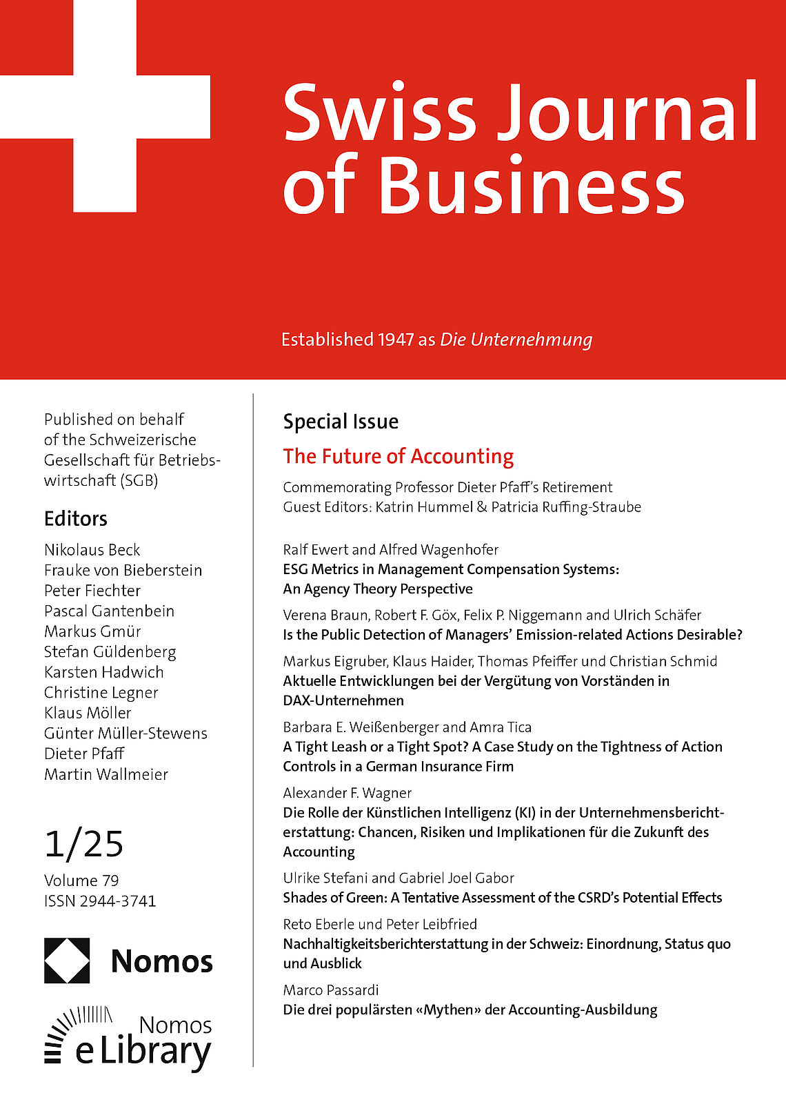 Der Nomos Verlag und die Schweizerische Gesellschaft für Betriebswirtschaft (SGB) als Herausgeberin der Zeitschrift haben einvernehmlich beschlossen, das traditionsreiche «Swiss Journal of Business» ab dem Jahrgang 2025 in das progressive Open Access-Format zu überführen. Die Open-Access-Darreichung der gesamten Zeitschrift auf Basis einer CC-BY-Lizenz erfolgt ab Ausgabe 1/25. Für die Veröffentlichung der einzelnen Beiträge erhebt der Verlag keine sog. Article Processing Charges (APC).