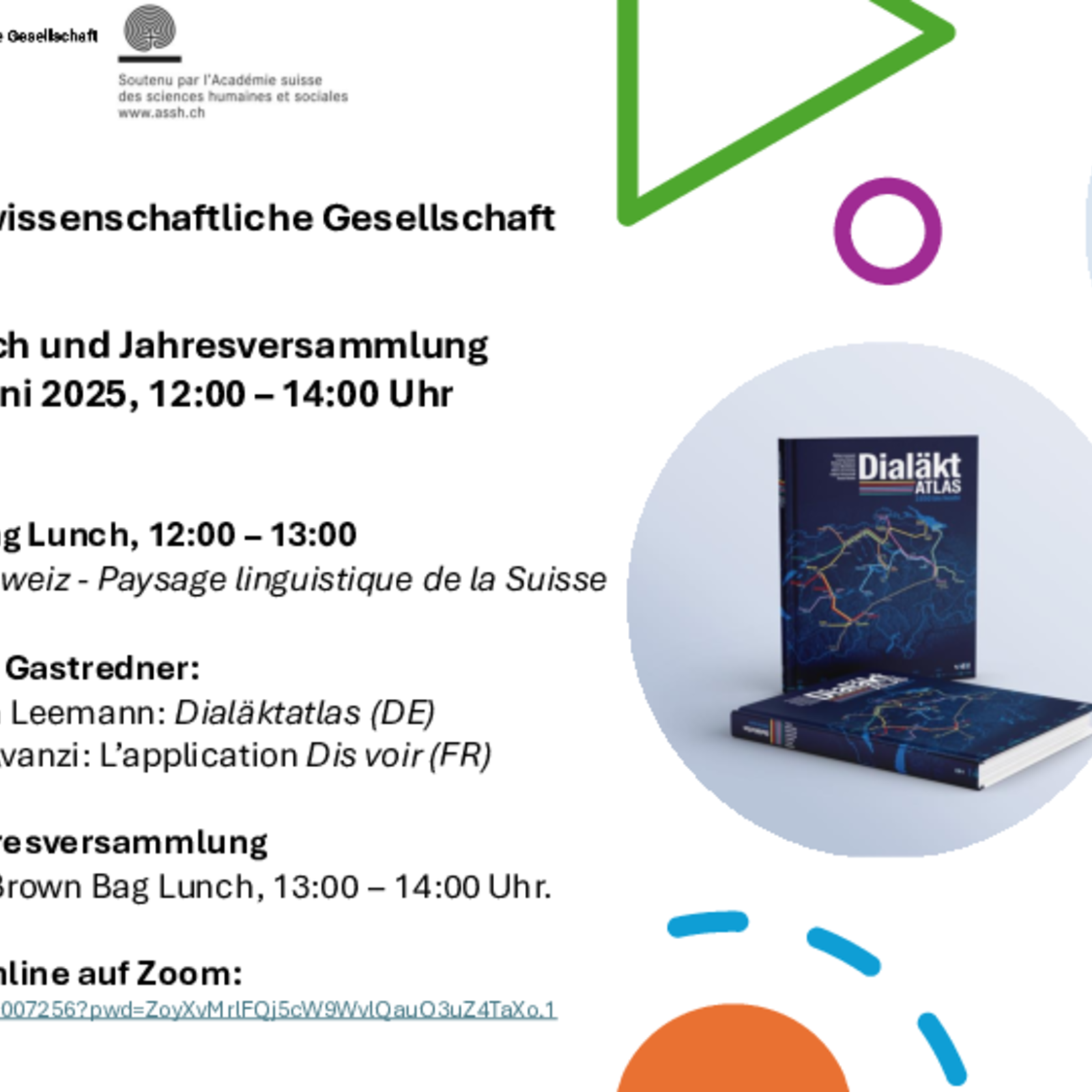 Die Vorträge finden von 12:00 - 13:00 auf Zoom statt und sind für alle interessierten Personen offen. Die Jahresversammlung der SSG/SSL findet im Anschluss von 13:00 - 14:00 statt und bleibt den Mitgliedern der Gesellschaft vorbehalten.