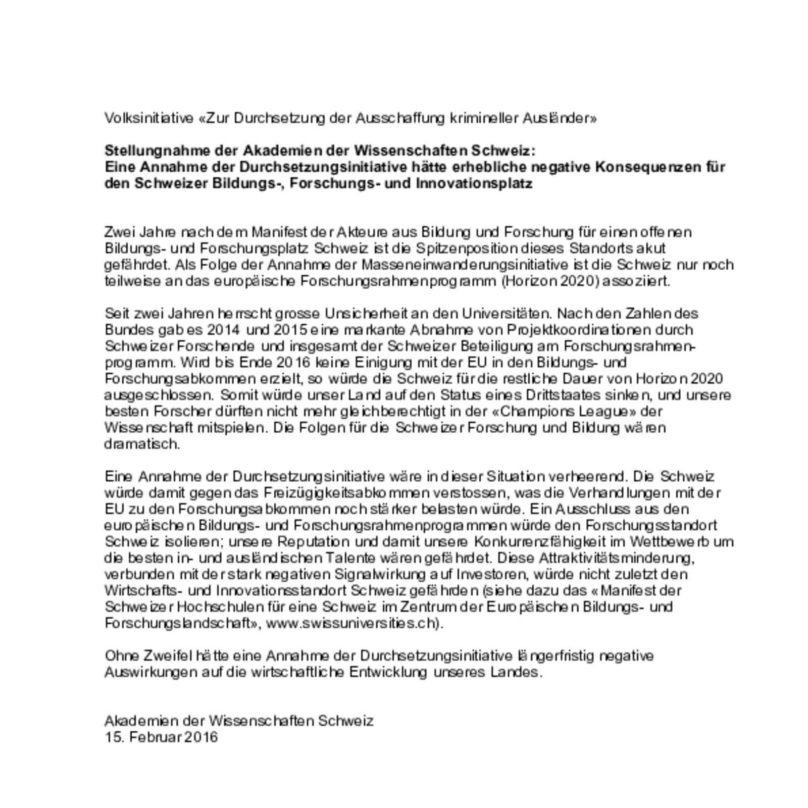 Eine Annahme der Durchsetzungsinitiative wäre in dieser Situation verheerend. Die Schweiz würde damit gegen das Freizügigkeitsabkommen verstossen, was die Verhandlungen mit der EU zu den Forschungsabkommen noch stärker belasten würde. Ein Ausschluss aus den europäischen Bildungs- und Forschungsrahmenprogrammen würde den Forschungsstandort Schweiz isolieren; unsere Reputation und damit unsere Konkurrenzfähigkeit im Wettbewerb um