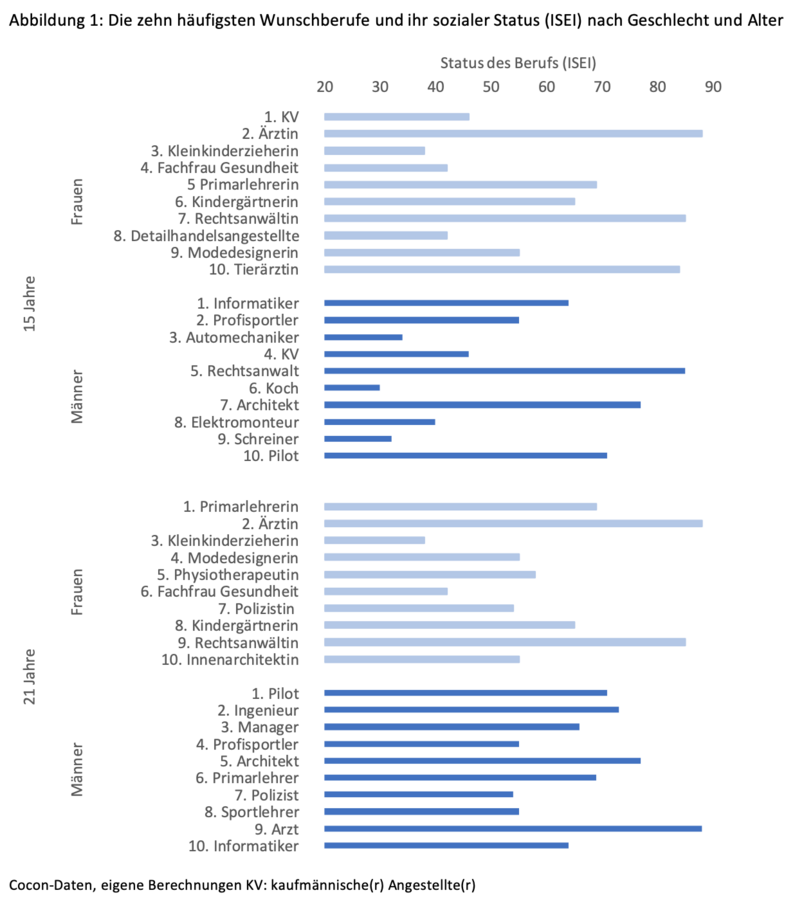 Junge Männer wünschen sich statushöhere Berufe als junge Frauen. Viele junge Männer wollen Pilot, Ingenieur, Manager oder Architekt werden, junge Frauen Primarlehrerin, Kleinkinderzieherin, Modedesignerin oder Physiotherapeutin. Junge Frauen stecken ihre beruflichen Ziele weniger hoch als junge Männer. Dies dürfte dazu beitragen, dass junge Frauen – trotz grösserem Schulerfolg – im Arbeitsmarkt schnell ins Hintertreffen geraten.