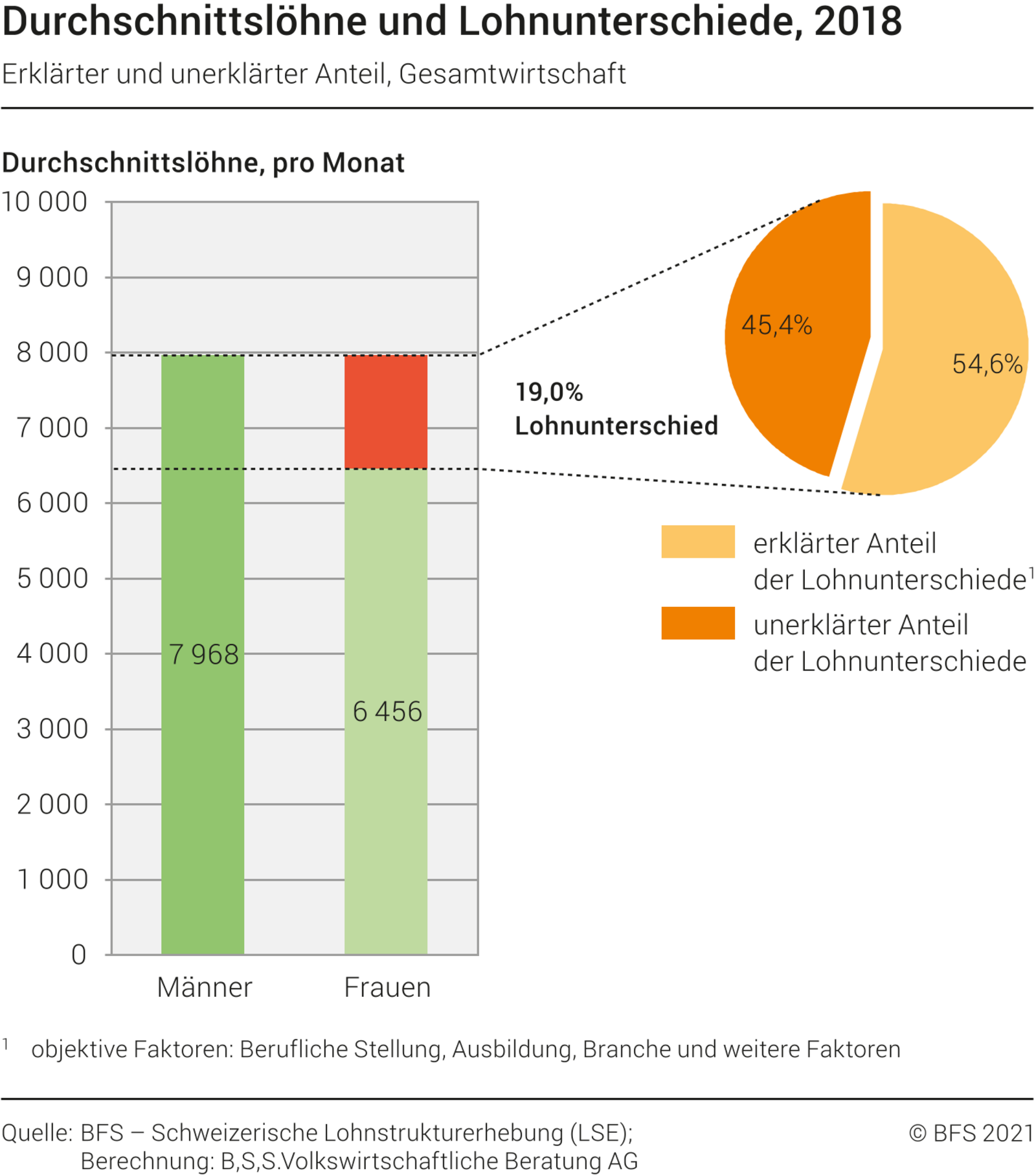 Der Grundsatz «gleicher Lohn für gleiche Arbeit» hat sich in der Schweiz nicht überall durchgesetzt, wie die Statistik zeigt. Ob in der Privatwirtschaft oder in öffentlichen Betrieben: Im Durchschnitt verdienten Frauen im Jahr 2018 19 Prozent weniger als Männer. 2016 waren es noch gut 18 Prozent weniger. Einen Teil der Lohnunterschiede lässt sich erklären: mit dem Bildungsniveau, der Anzahl Dienstjahre oder ob jemand eine Führungsposition innehat. Gemäss Bundesamt für Statistik reichen solche Erklärungen für rund 55 Prozent der Fälle aus.